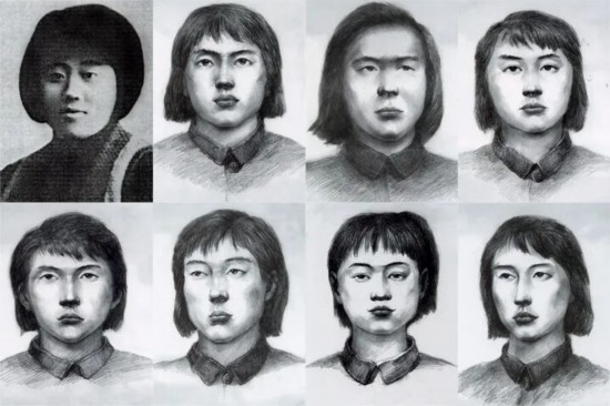 “八女投江”八名女戰士的肖像拼版照片:左上為冷雲生前照片﹔其他七名女戰士為速寫畫像,生前未留下照片。新華社發