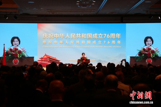 當地時間9月25日,中國駐日本大使館在東京新大谷飯店舉行慶祝中華人民共和國成立76周年招待會。圖為日本外務大臣政務官生稻晃子致辭。