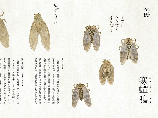 8月12日-17日。寒蝉(ひぐらし)是秋天蝉的一种,它的名字与“日暮し”(傍晚)的读音一致,因其常在傍晚鸣叫而得名。日本人认为寒蝉“カナカナカナ”的叫声十分悲凉,似乎在为消逝的夏天而感到惋惜。