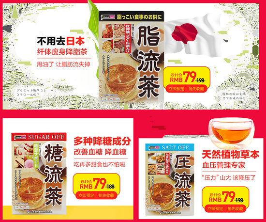 此外,山本汉方著名的保健茶系列也将在双11期间大减价。如纤体瘦身降脂的脂流茶、改善血糖的糖流茶以及降血压的压流茶。