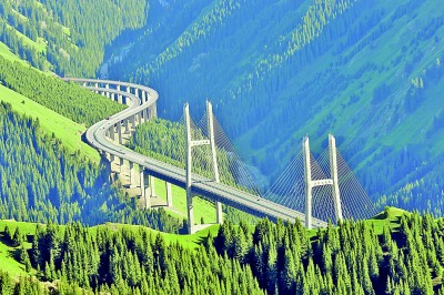 2011年9月30日,果子沟大桥正式通车运营。这是国内首座双塔双索面钢桁梁斜拉桥,被誉为“新疆第一桥”。