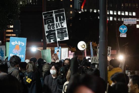 数百名日本民众21日晚在位于东京的首相官邸前举行集会,抗议日本首相高市早苗近日在国会发表的涉台错误言论,要求其撤回相关表态并作出解释和道歉。新华社记者贾浩成摄