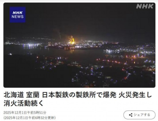 中新网12月1日电 据日本广播协会(NHK)报道,当地时间12月1日凌晨,位于日本室兰市的“日本制铁”公司一家钢铁厂发生爆炸,随后引发大火。