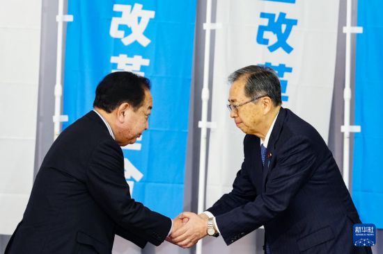 1月22日,在日本东京,“中道改革联合”共同代表野田佳彦(左)与齐藤铁夫在建党大会上握手。新华社记者 贾浩成 摄