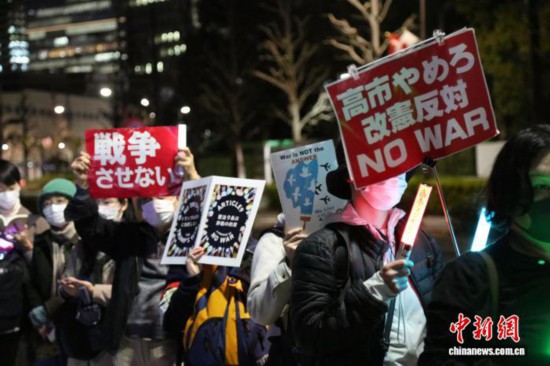 当地时间19日晚,超万名日本民众在位于东京的日本众议院第二议员会馆前集会,反对高市早苗政府近期释放修宪信号、决定部署远程导弹等危险政策动向。中新社记者 朱晨曦 摄