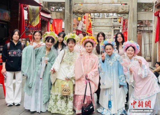 图为3月19日,日本常叶大学代表团在漳州古城体验簪花造型。闽南师范大学供图