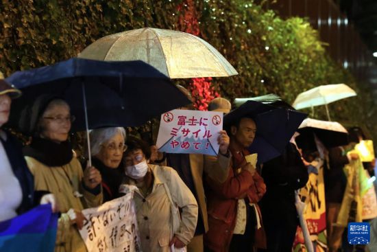 在东京的日本防卫省门前,大量抗议者冒雨高喊“必须停止部署远程导弹!”“给民众一个合理解释!”“反对进行战争准备!”等口号。